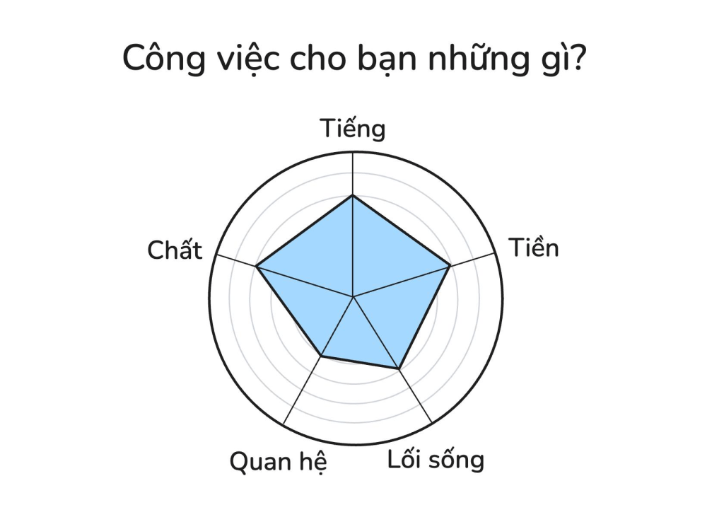 Thứ nhất, em nên hiểu mình muốn gì từ công việc đầu tiên của mình. Anh nghĩ, những thứ công việc có thể cho mình cũng chỉ rơi vào 5 phạm trù dưới đây:
